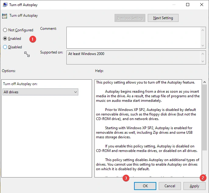 - 导航至计算机配置 > 管理模板 > Windows 组件 > 自动播放策略。
