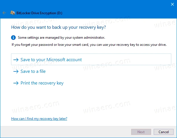 步骤 5 – 由于 BitLocker 使用基于软件的加密,因此如果您想删除加密,它会询问您是否要备份恢复密钥(解密密钥)。您可以将密钥另存为文档、将其打印在纸上或直接保存到您的 Microsoft 帐户。