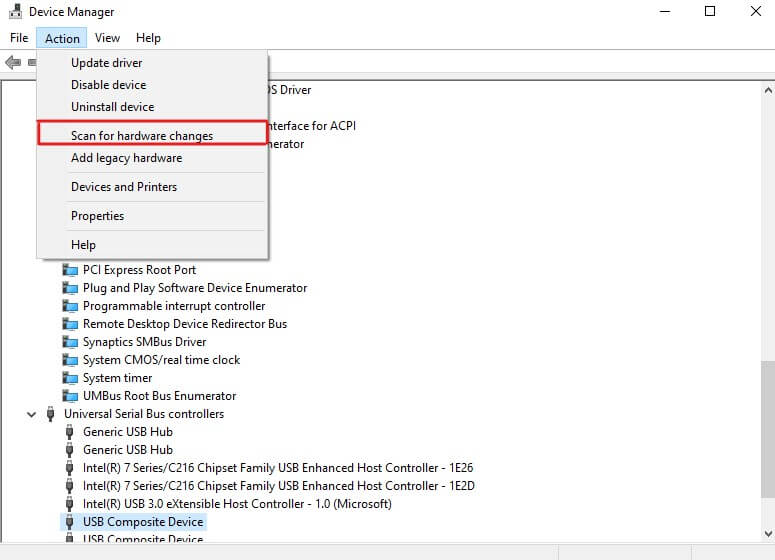 - 从计算机的设备管理器中,查看标题菜单,选择行动, 进而扫描硬件变化。