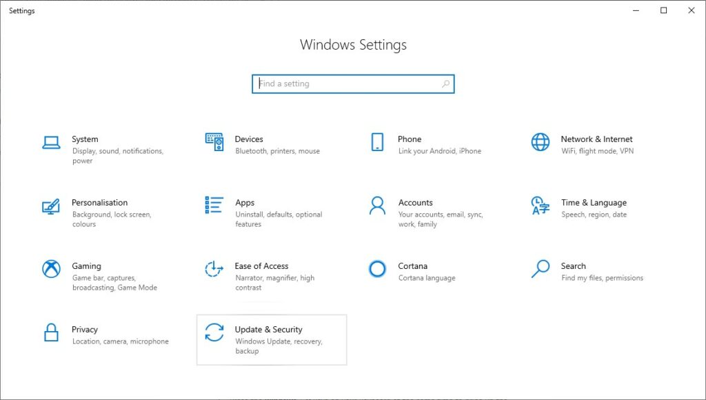 在 Windows 设置中找到更新和安全选项卡