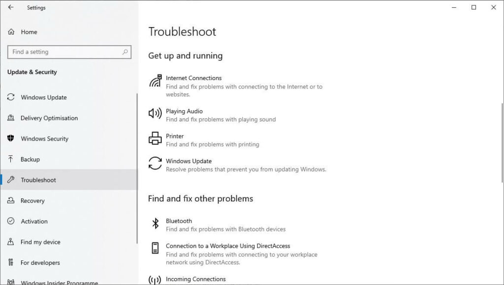 - 选择更新与安全选项卡,向下滚动,然后从左侧菜单中选择故障排除。