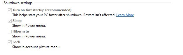 - 前往关机设置部分。确保开启快速启动框未被选中。如果是,请取消选中该框。