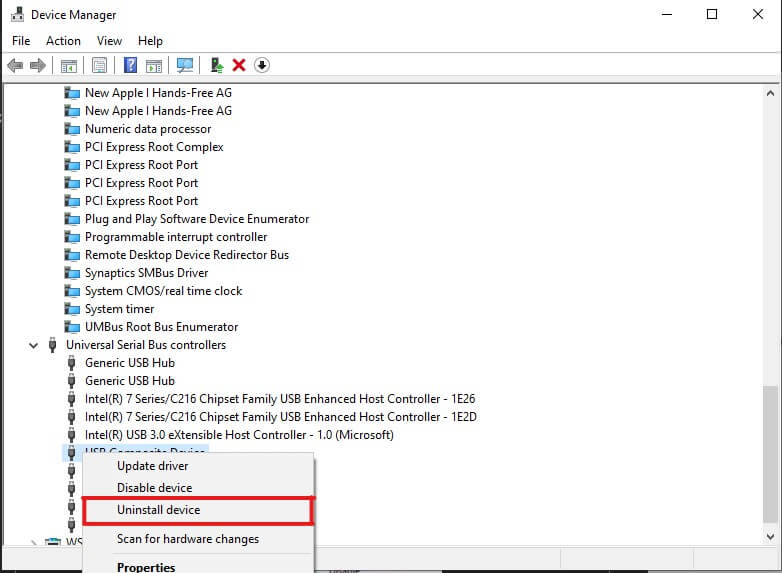 - 打开通用串行总线控制器部分并选择未知 USB 设备(设置地址失败)从列表中;右键单击并单击卸载。按照屏幕上的提示操作后,未知设备将被删除。