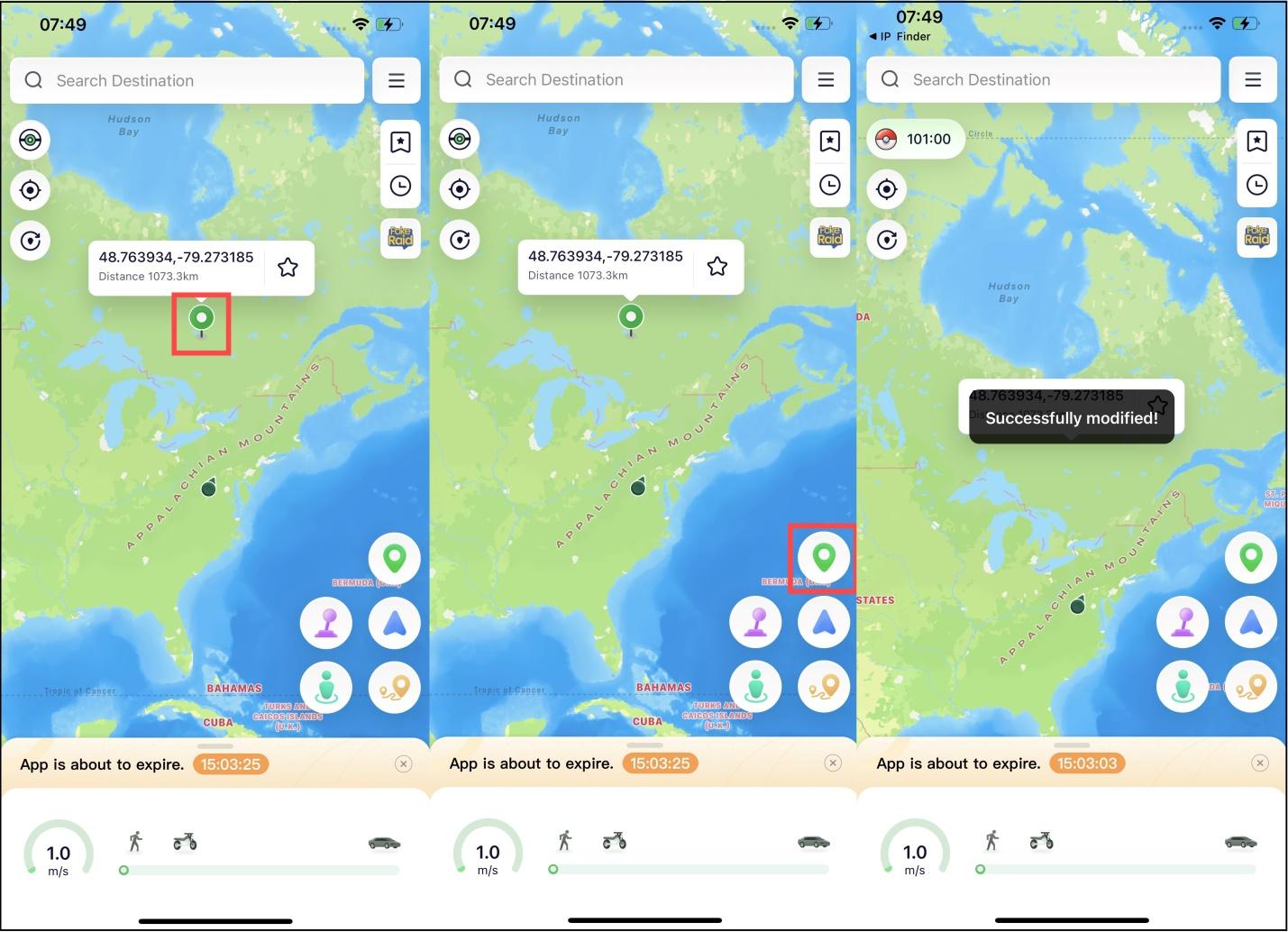 配置应用程序后,打开它,搜索目标地址,然后单击右侧菜单中的“更改位置”按钮。您的位置将立即更改。