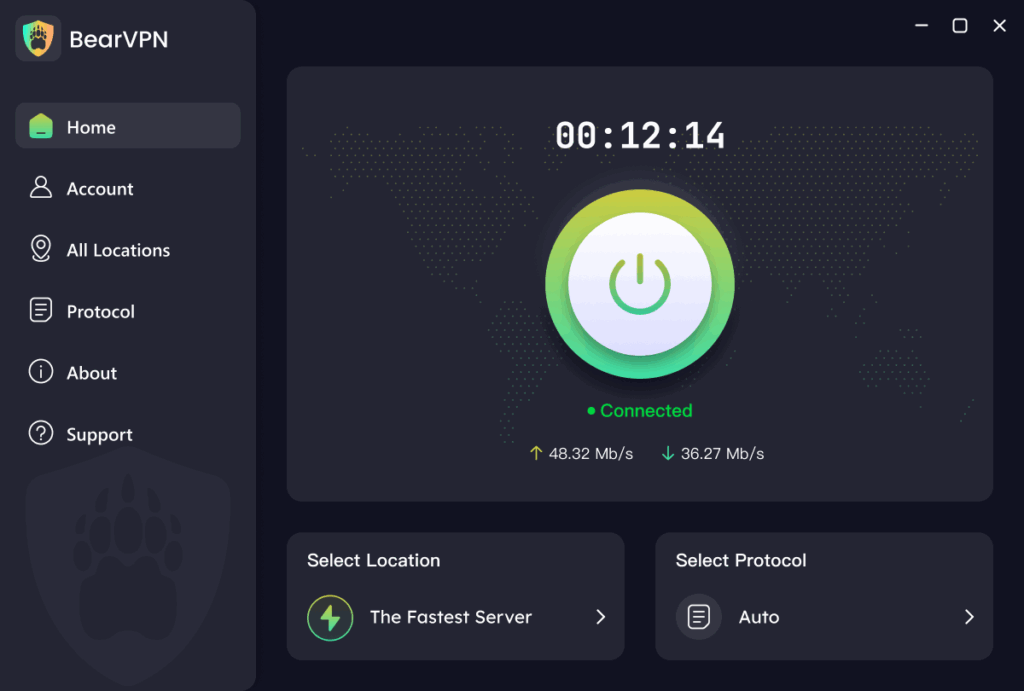 BearVPN 使用 AES-256 加密,提供严格的无日志政策,支持有助于避免 VPN 检测的模糊或“隐形”模式,并具有内置终止开关。这意味着即使 VPN 连接断开,您的真实 IP 也不会泄露到赌场网站。对于加密货币赌场玩家来说,这一点尤其重要:您需要匿名、干净的 IP 历史记录以及防泄密保护。