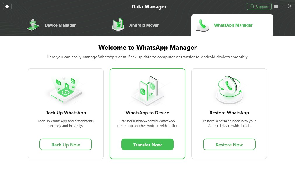 WhatsApp Manager 功能可让您全方位管理 WhatsApp 数据 – 轻松传输、备份和恢复您的 WhatsApp 数据,让您不再担心数据丢失!
