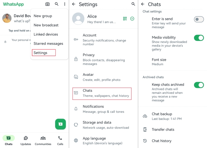 在WhatsApp的设置中,您可以找到导出聊天记录功能,然后您可以使用它来将WhatsApp聊天记录一一导出。要从 iPhone 或 Android 设备上的聊天中导出聊天记录,请按照以下步骤操作。