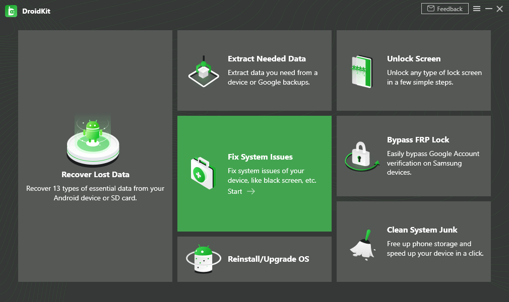 安装后启动 DroidKit。然后从主屏幕中选择“修复系统问题”选项。使用 USB 电缆连接您的 Android 设备。