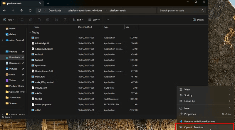 步骤 5. 按住 Shift 键并在 ADB 文件夹内右键单击以打开命令窗口或 PowerShell。这将在计算机上的 ADB 目录中打开命令行。