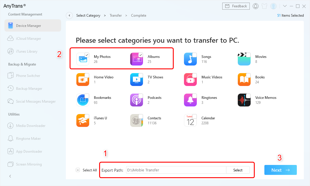步骤 2. 选择要传输的项目 > 单击“选择”选择导出路径 > 单击“下一步”开始传输。