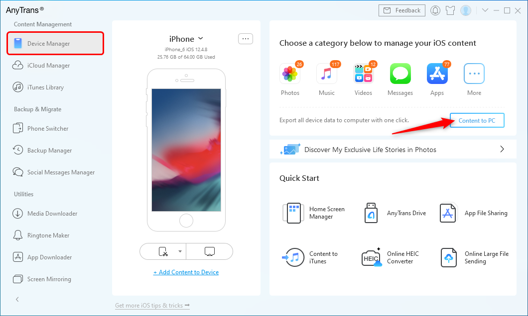 步骤1。 下载 AnyTrans,安装并打开 > 通过 USB 线将 iPhone 连接到电脑 > 单击设备管理器 > 如果要向 iPhone 添加内容,可以单击手机屏幕上方的“+”按钮拖放内容。如果您想将 iPhone 数据传输到 Mac,请选择“内容到 Mac”。这里我们选择Content to Mac。