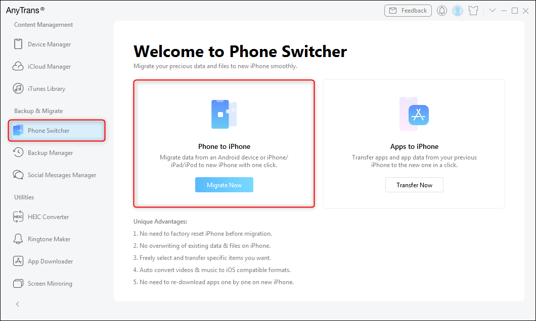 步骤1。 下载 AnyTrans,安装并启动它 > 通过 USB 线将两部 iPhone 连接到计算机 > 单击电话切换器 > 点击选项 – 电话到 iPhone。