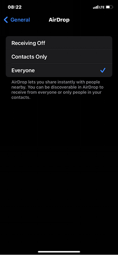 - 不正确的 AirDrop 设置:AirDrop 有一个非活动和两个活动设置选项 [接收关闭、仅限联系人和所有人]。这些设置中的每一项都有其功能,并且可能会影响 AirDrop 连接。例如,“接收关闭”选项会阻止人们连接您的设备。仅联系人允许您的联系人列表中的人员与您的 AirDrop 建立联系。最后,Everyone 允许您从附近任何活动的 AirDrop 发送或接收数据。