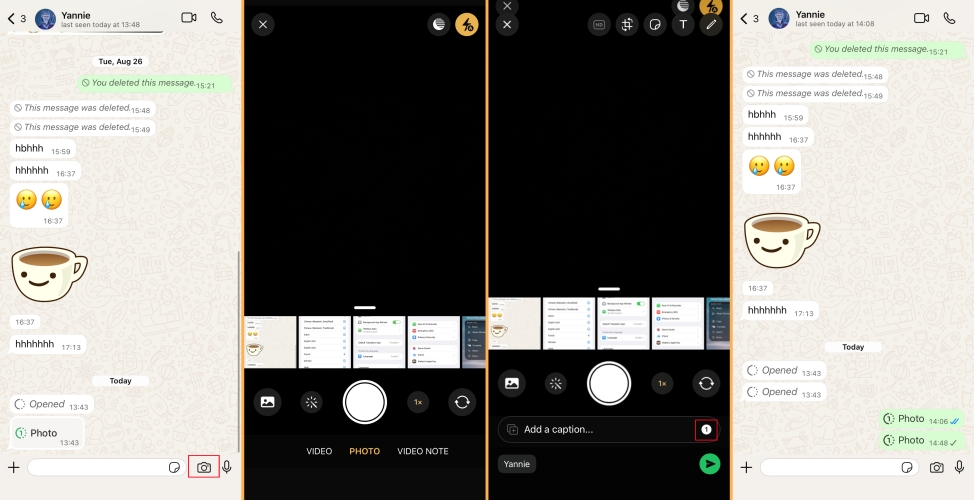 步骤1。转到某个WhatsApp聊天,然后点击相机图标。