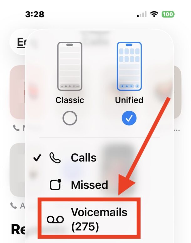 这就是您现在在 iOS 26 的“电话”应用程序中默认访问语音邮件的方式。无论出于何种原因,Apple 已经确定不需要在“电话”应用程序中快速轻松地访问语音邮件,因此他们将其塞入了 iOS 早期版本中不存在的下拉菜单中。