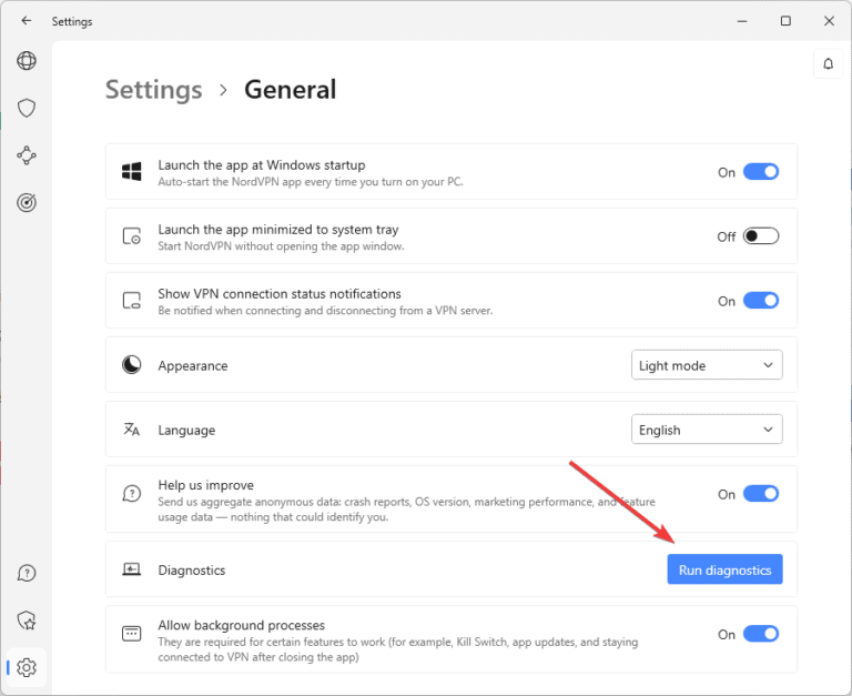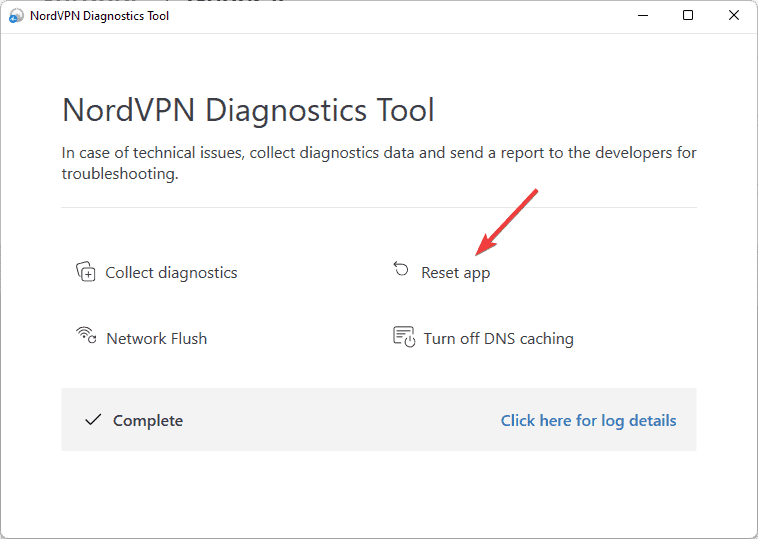 - 在“NordVPN 诊断工具,“ 点击 ”重置应用程序”。