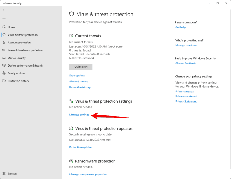 - 在下面 ”病毒和威胁防护设置,“ 点击 ”管理设置”。