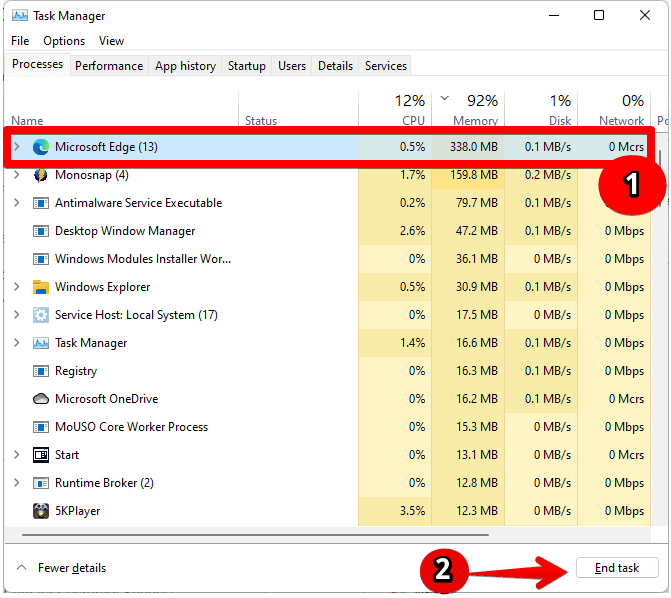 - 选择使用大量资源的应用程序,然后单击“结束任务”在右下角。
