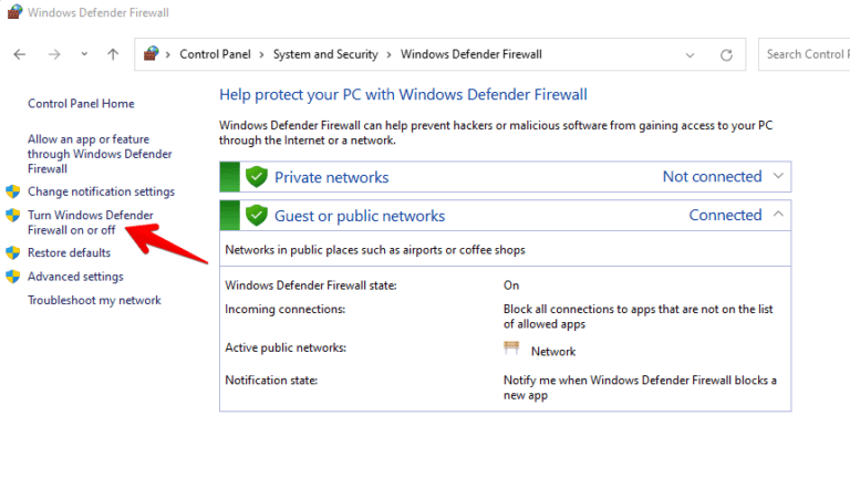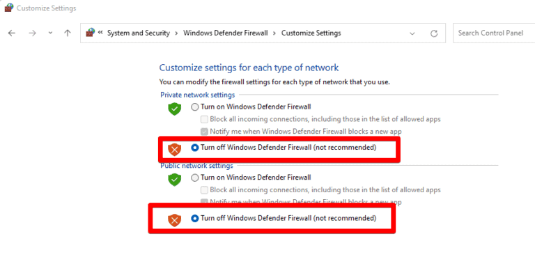 - 选择 ”关闭 Windows 防火墙(不推荐)” 在两个“下专用网络设置“ 和 ”公共网络设置”。