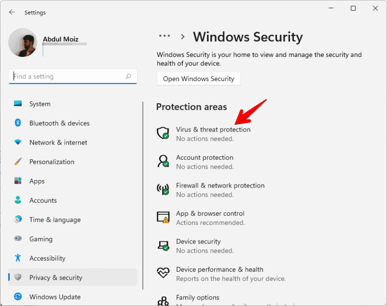 - 在右侧菜单上,单击“病毒和威胁防护”。