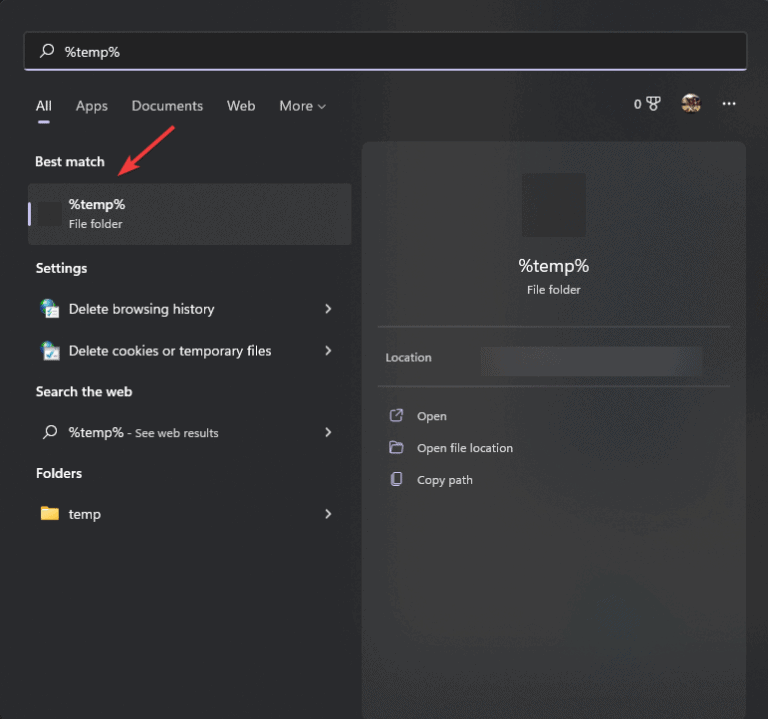 - 单击“开始” 按钮并输入“%温度%”,然后按“进入”按钮打开垃圾文件夹。
