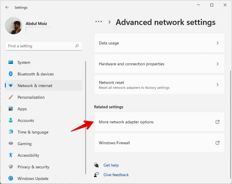 - 选择 ”高级网络设置”并选择“更多网络适配器选项”。