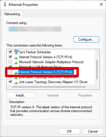 - 在“联网”选项卡,取消选中“互联网协议版本 6 (TCP/Pv6)”。