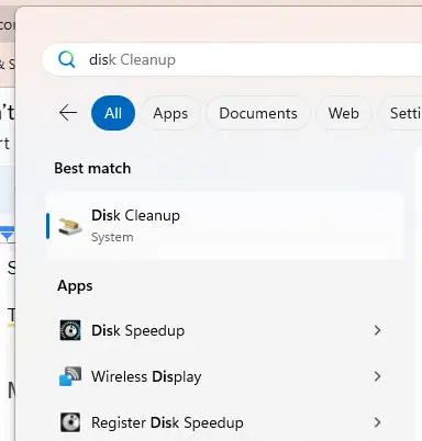 2. 从搜索结果中选择磁盘清理。