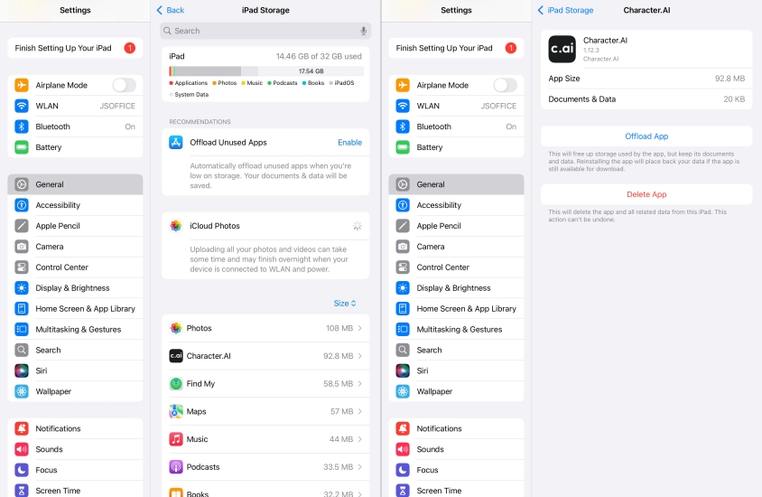 设备存储空间不足可能会影响应用程序的运行方式。当Character AI在您的iPad上无法工作时,请前往“设置”>“通用”>“iPad存储”来检查设备上的存储空间。如果存储空间不足,请删除未使用的应用程序、照片或视频,然后重新启动设备。