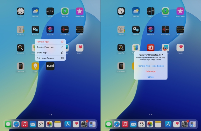 如果应用程序文件已损坏,执行彻底卸载并重新安装会有所帮助。点击并按住主屏幕上的角色 AI 图标,然后点击删除应用程序 > 删除应用程序将其删除。之后,前往App Store并重新安装。