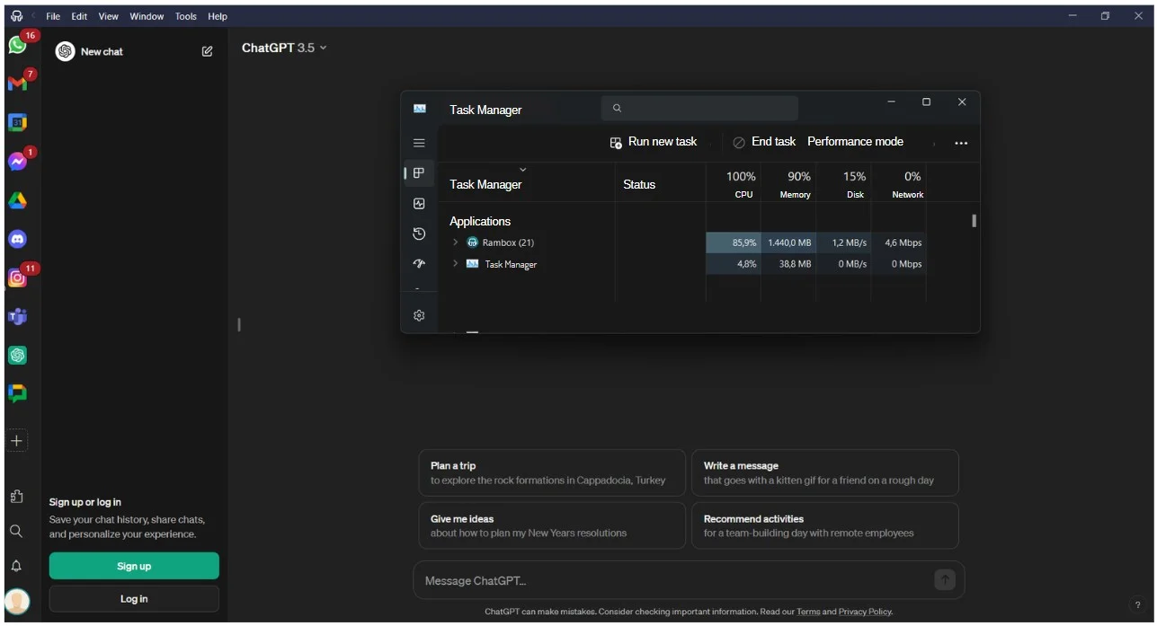 我对此进行了测试。我选取了 Rambox 中最常用的 10 个应用程序并进行了比较Chrome 和 Rambox 中使用的内存量。