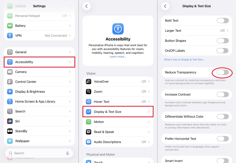 - 解决方案 3. 降低透明度。前往设置 > 辅助功能 > 显示和文字大小。然后启用降低透明度。