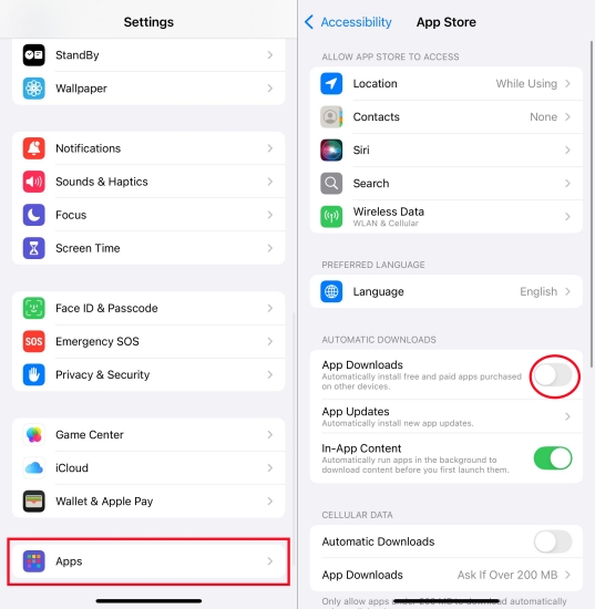 - 解决方案 4. 禁用媒体自动下载。打开设置应用程序并点击应用程序 > 应用程序商店。然后禁用应用程序下载在自动下载下。