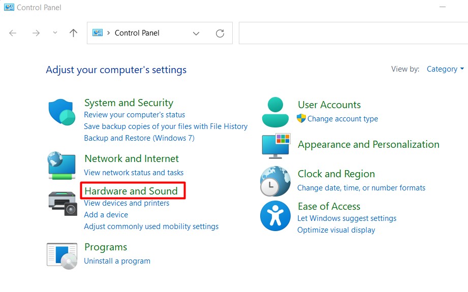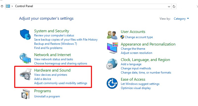 步骤4:导航光标到硬件和声音”功能,然后移动以选择“硬件和设备”选项。