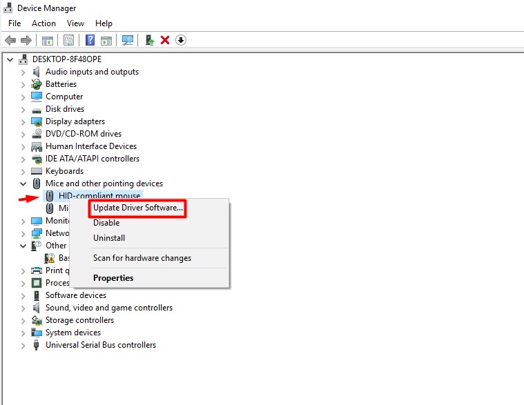 步骤3:选择“老鼠”选项并运行“更新驱动程序“ 功能