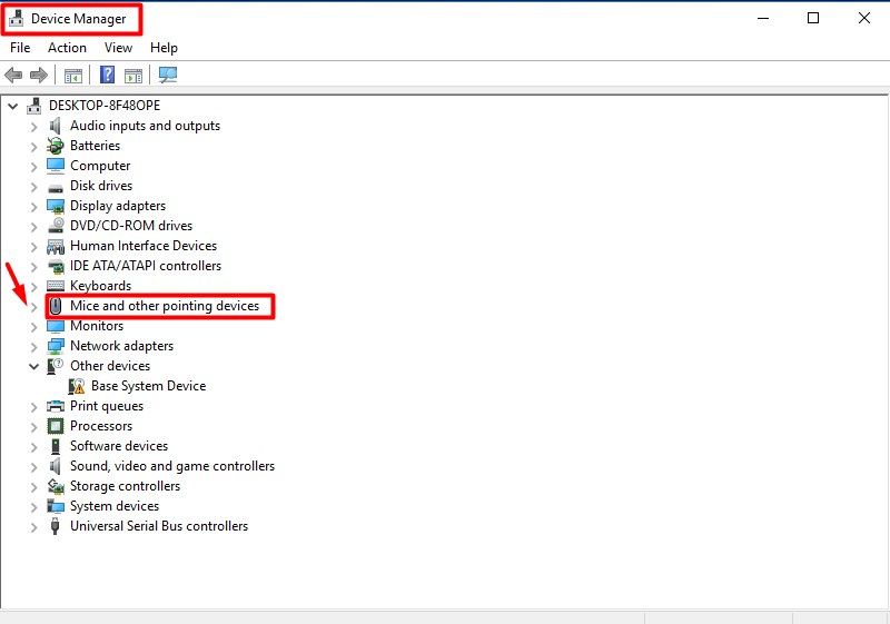 步骤2:打开你的装置经理并寻找“老鼠和其他指向设备”选项。您应该在其侧面选择箭头。
