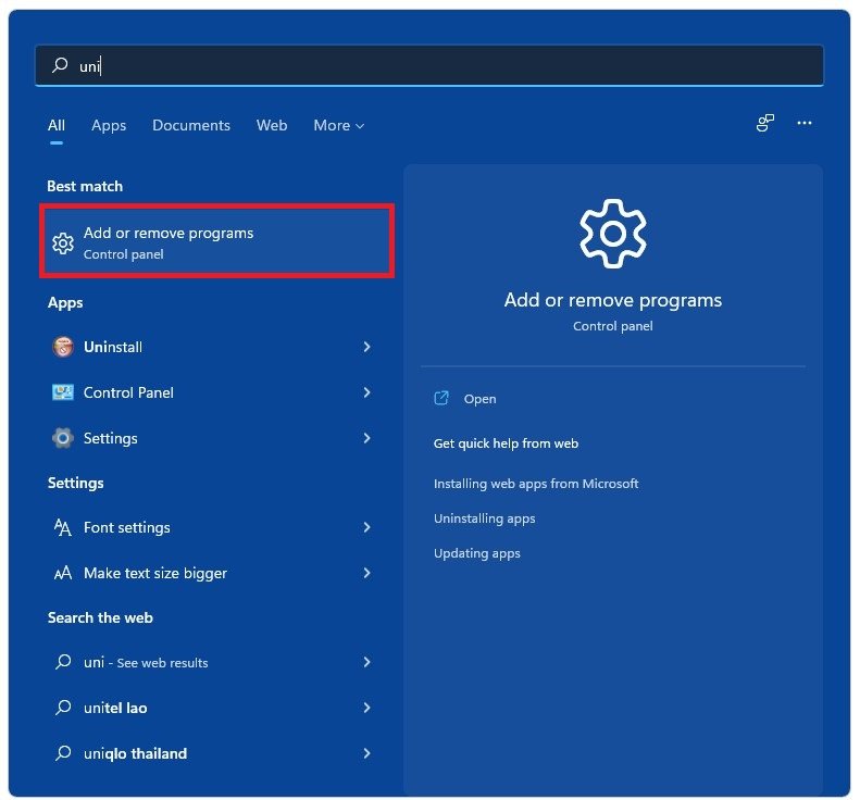 有时,第三方应用程序会导致屏幕闪烁问题。搜索卸载在任务栏中搜索以打开应用程序和功能系统设置窗口