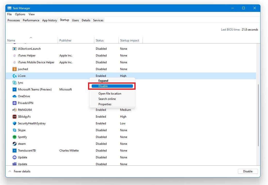 要禁用某个程序,请右键单击该程序,然后从上下文菜单中选择“禁用”。这将阻止所选应用程序在系统引导期间自动启动。
