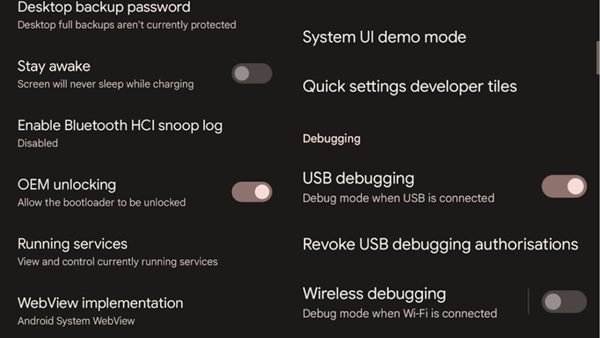 启用开发者选项后,需要打开设置并查找开发者选项。按开发者选项和通过 OEM 解锁启用 USB 调试。