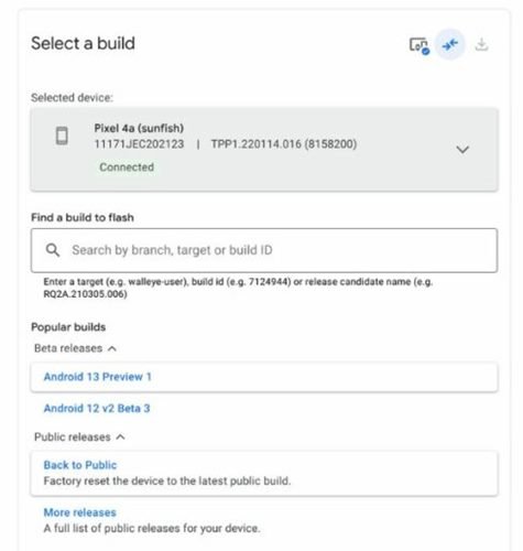 Android Flash Tool 可用于在您的设备上安装 Android 版本。启用USB调试后,您需要打开PC的网络浏览器并访问网站flash.android.com。