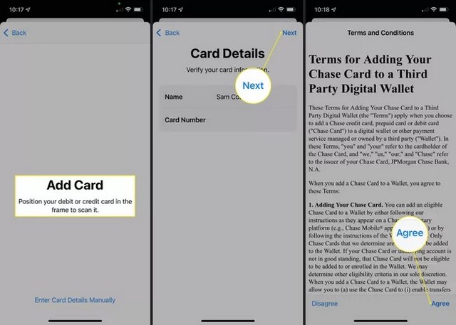 4. 将您的信用卡放在屏幕取景器中,钱包应用程序将检测并添加它。检查卡号并按下列的。