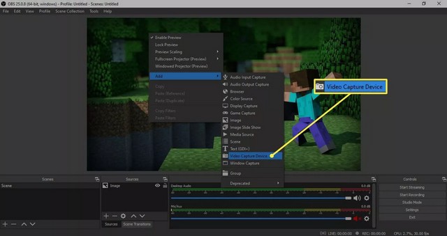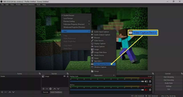 7. 打开控制台,然后右键单击 OBS studio 工作区并选择添加>视频采集设备。