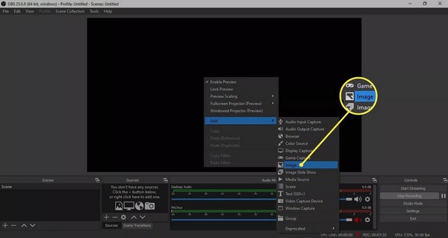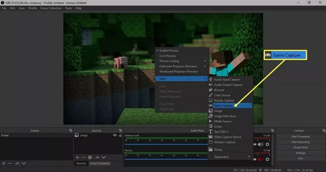 4. 要从 PC 流式传输游戏片段,请右键单击空白工作区并选择添加>游戏捕捉。