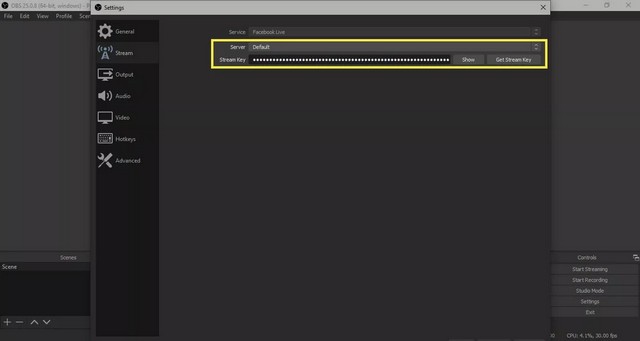 9. 在您的广播软件中,选择脸书直播为服务。要在 OBS Studio 中执行此操作,请转至文件>设置>溪流。