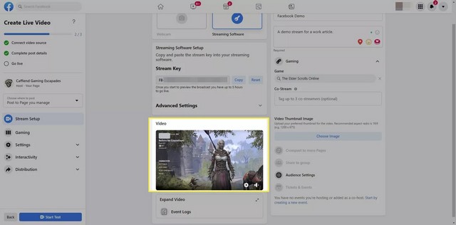11. 设置好流媒体后,开始在流媒体软件中进行广播。 Facebook 上会出现预览。选择小窗口将其放大。