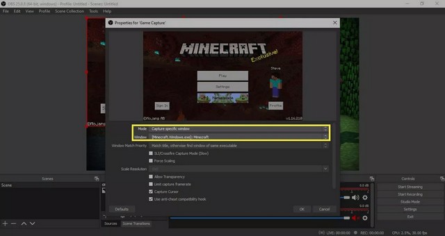5. 定义模式在捕获特定窗口,然后选择你的游戏,例如窗户(程序必须正在运行)。