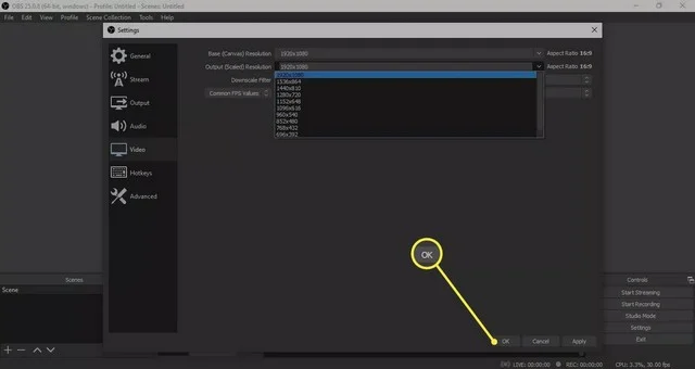 1. 前往文件>设置>视频并修改决议基本的等出口在1920×1080,然后选择好的。这会将您的流大小调整为适合广播的最佳宽高比。