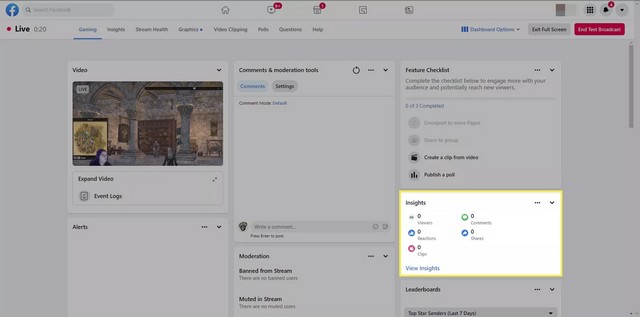 上线后,Facebook 会将您带到创作者工作室,您将在其中看到有用的信息,例如观看者数量、直播运行状况和评论。您可以随时返回创作者工作室来管理您的源并上传视频。选择见解查看观众的统计数据和收入。