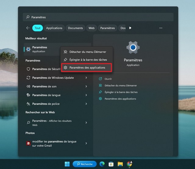 2. 搜索设置,右键单击第一个结果并选择选项应用程序设置。