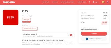 我找到了可靠的解决方案通过一个名为制造雾气,这让我得到官方 F1 TV Pro 帐户仅限每年 32.99 美元(约 30 欧元)。注册过程非常简单:我通过 GamsGo 网站购买了 F1 TV Pro 年度套餐,并立即收到了一封包含我的 F1 TV 登录凭据的电子邮件。没有复杂的设置或等待时间——我可以立即使用该帐户。